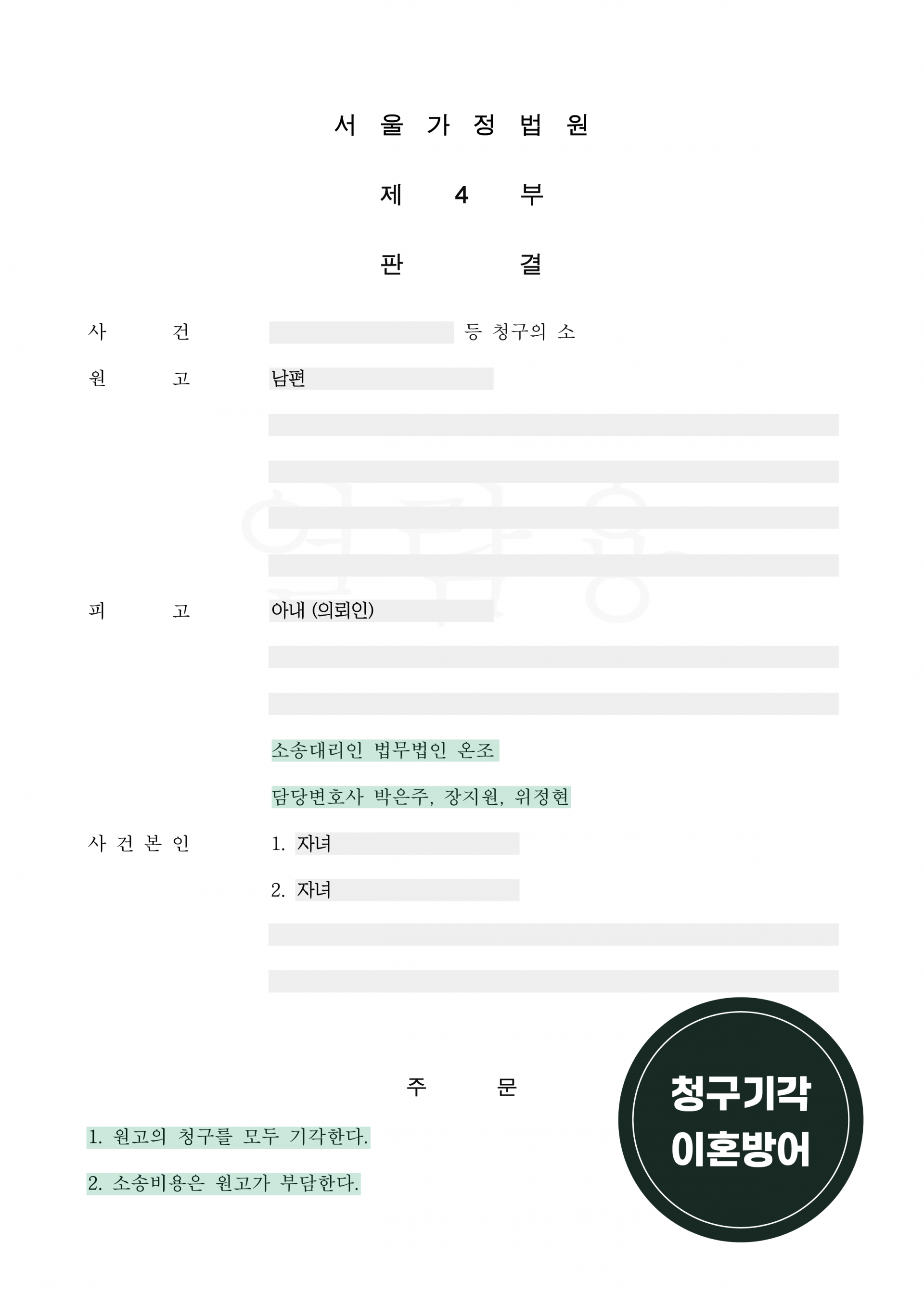 의뢰인께서는 최종적으로 이혼피고방어 청구기각 판결이 나온 뒤에야 심적으로 안정을 되찾을 수 있게 되었다고 하셨습니다.