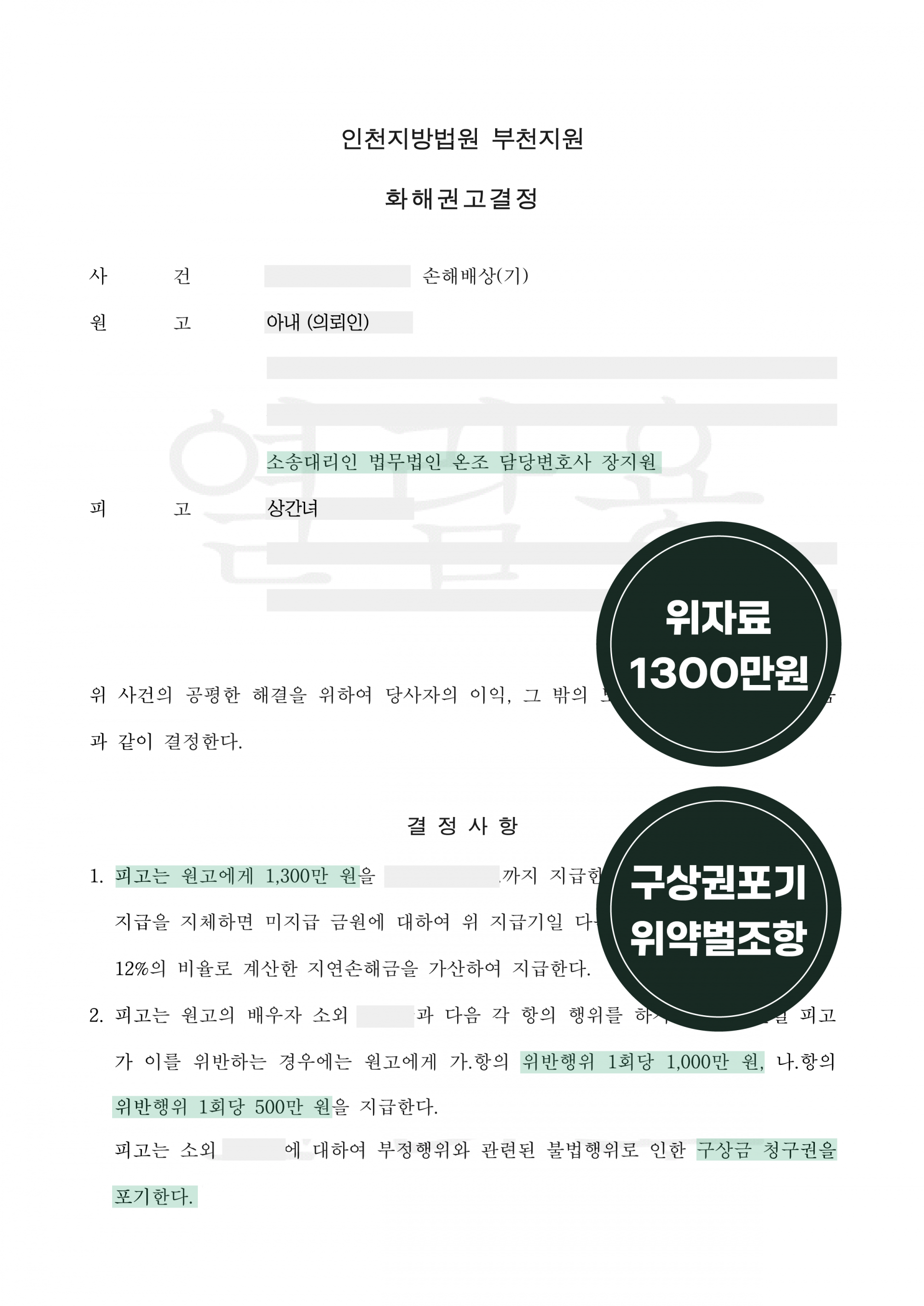 [인천지방법원 부천지원] 상간녀소송 원고 대리하여 화해권고결정 위자료 1,300만원, 구상권 포기 및 위약벌 조항으로 합의에 성공한 사례