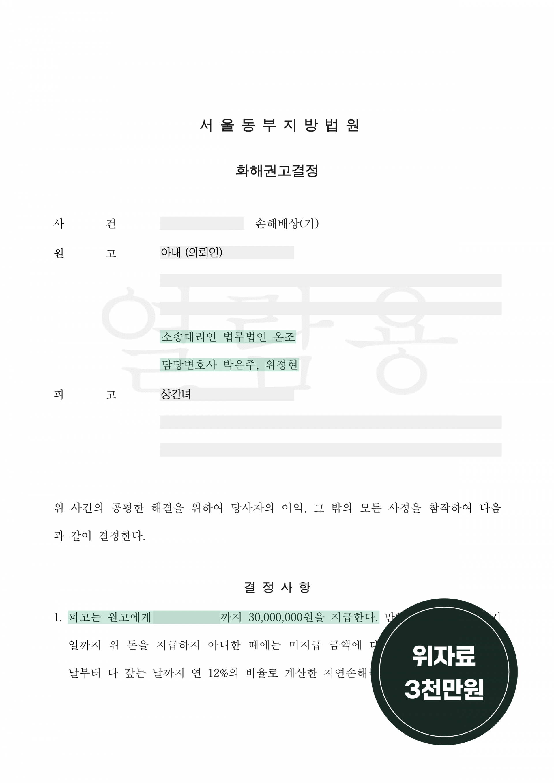 서울동부지방법원 상간소송 관할 재판부는 위자료 3,000만 원을 인용하는 화해권고결정을 내려주었습니다.