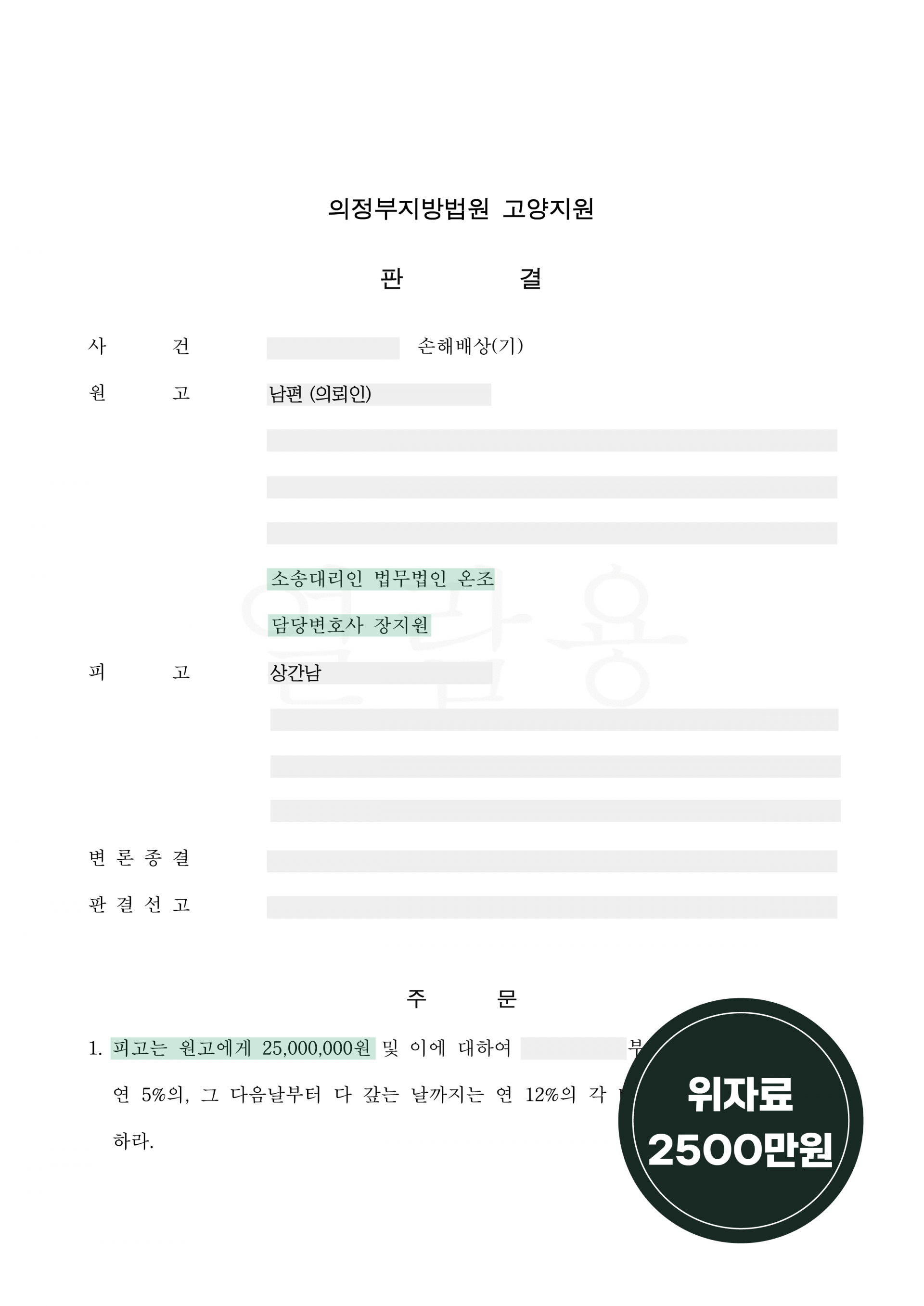 의정부지방법원 관할은 저희의 주장을 인용하며 위자료 2,500만 원의 판결을 내려주었습니다. 혼인 생활, 부정행위 기간, 원고가 받았을 정신적 고통의 정도, 선행 판결 확정 이후에 반복되었다는 점을 토대로 판결이 내려졌습니다.
