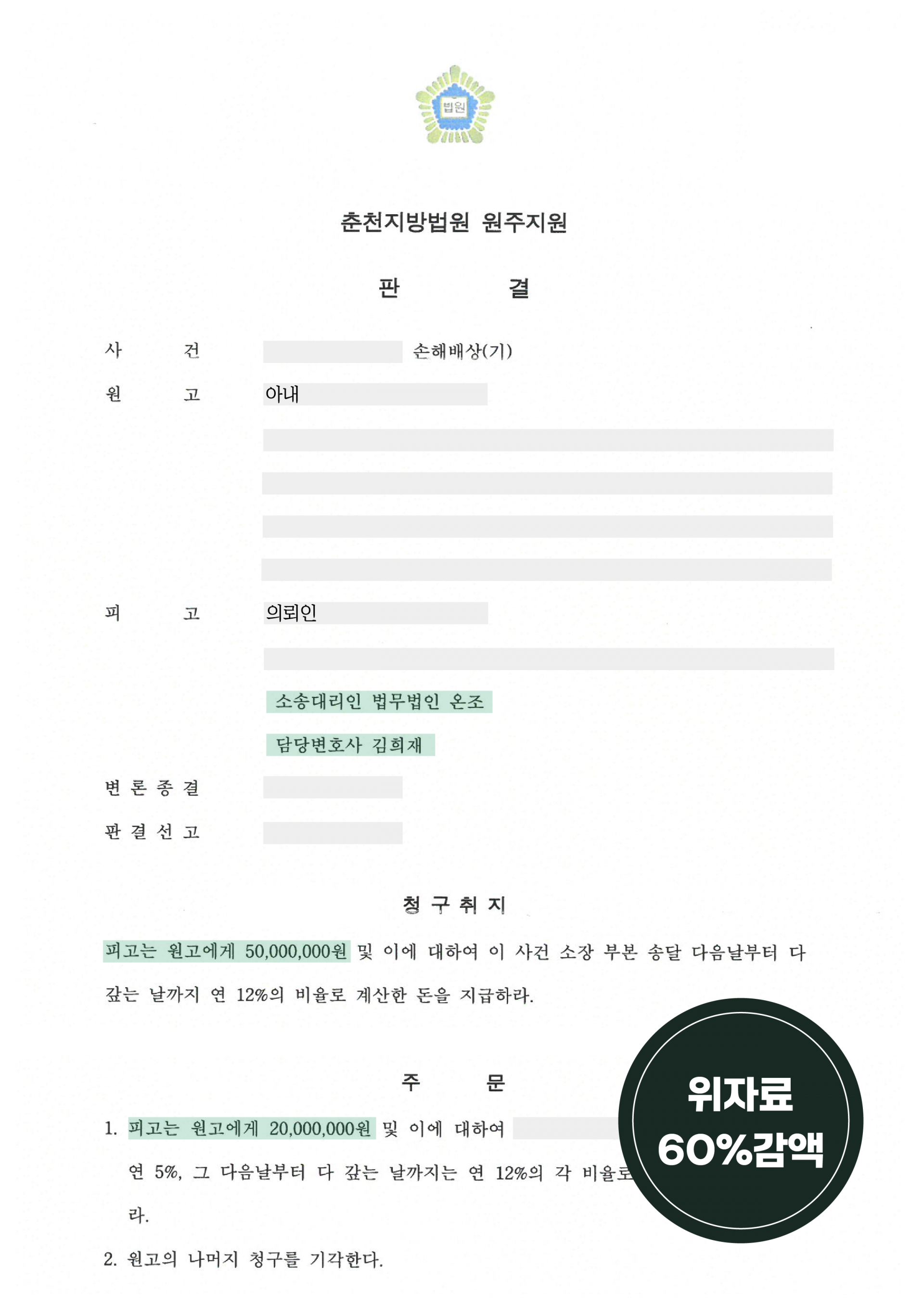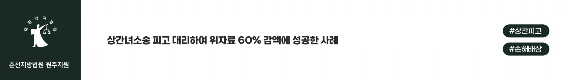 [춘천지방법원 원주지원] 상간녀소송 피고 대리하여 위자료 60% 감액에 성공한 사례