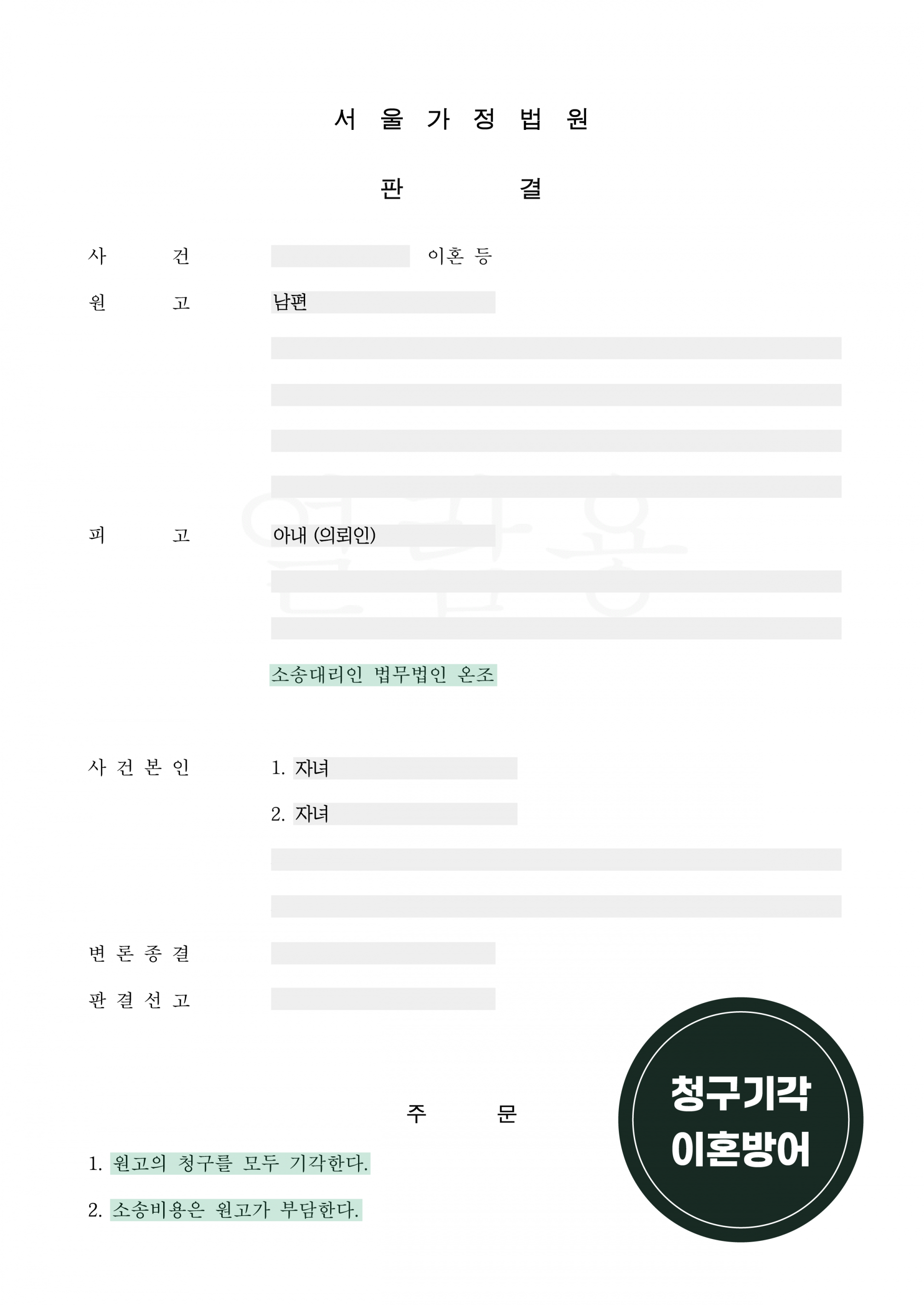 이혼을 전제로 한 위자료, 재산분할, 친권자 및 양육자 지정, 양육비 청구도 모두 기각하며 의뢰인의 바람대로 사건이 성공적으로 종결될 수 있었습니다.