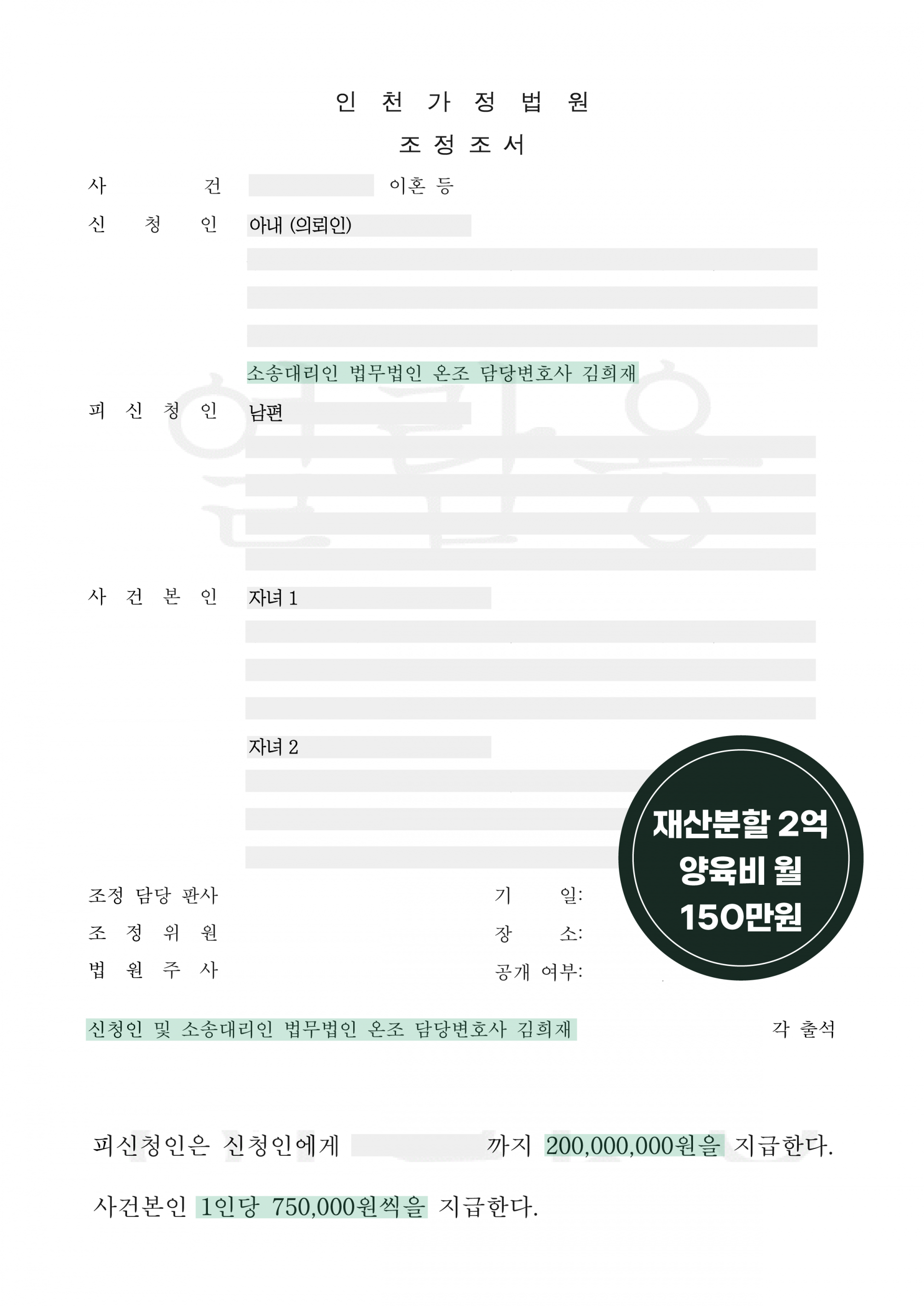 [인천가정법원] 조정이혼 원고 대리하여 재산분할 2억 원, 기여도 50%, 양육비 월 150만 원 인정받은 사례