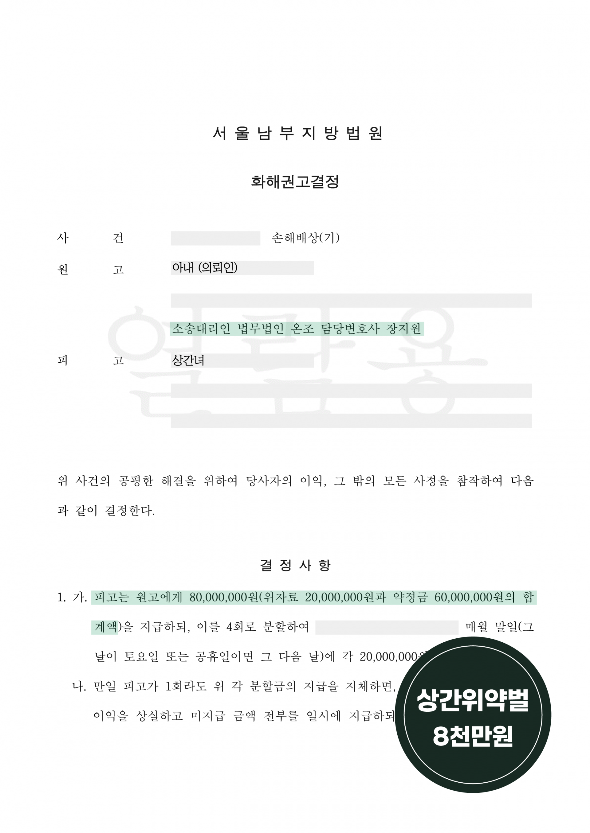 서울남부지방법원은 법무법인 온조의 주장을 모두 받아들여, 피고가 원고에게 총 8,000만 원 (위자료 2,000만 원 + 약정금 6,000만 원)을 지급하라는 화해권고결정을 내렸습니다.