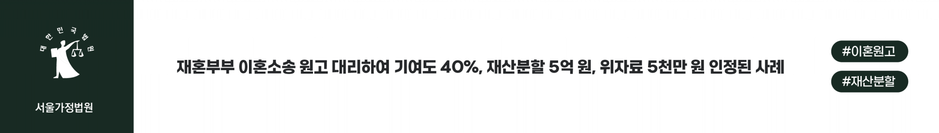 [서울가정법원] 재혼기간 6년 이혼소송 원고 대리하여 기여도 40%, 재산분할 5억 원, 위자료 5천만원 인정된 사례
