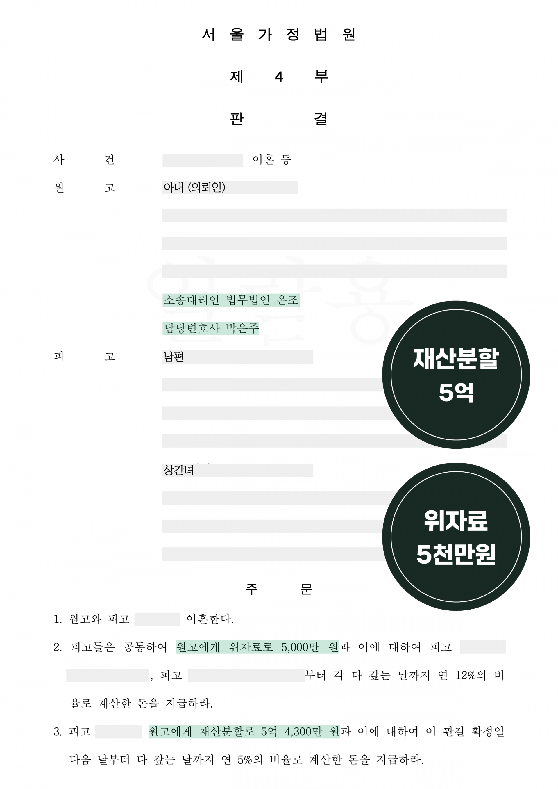 담당 재판부에서도, 피고들의 파렴치한 외도행각에 노여워하셔서 피고들에게 공동하여 위자료 5,000만원을 배상하라는 판결과 더불어 지연이자도 이례적으로 이혼소송이 제기된 시점부터 연 12%의 비율로 지급하도록 판단하였습니다.