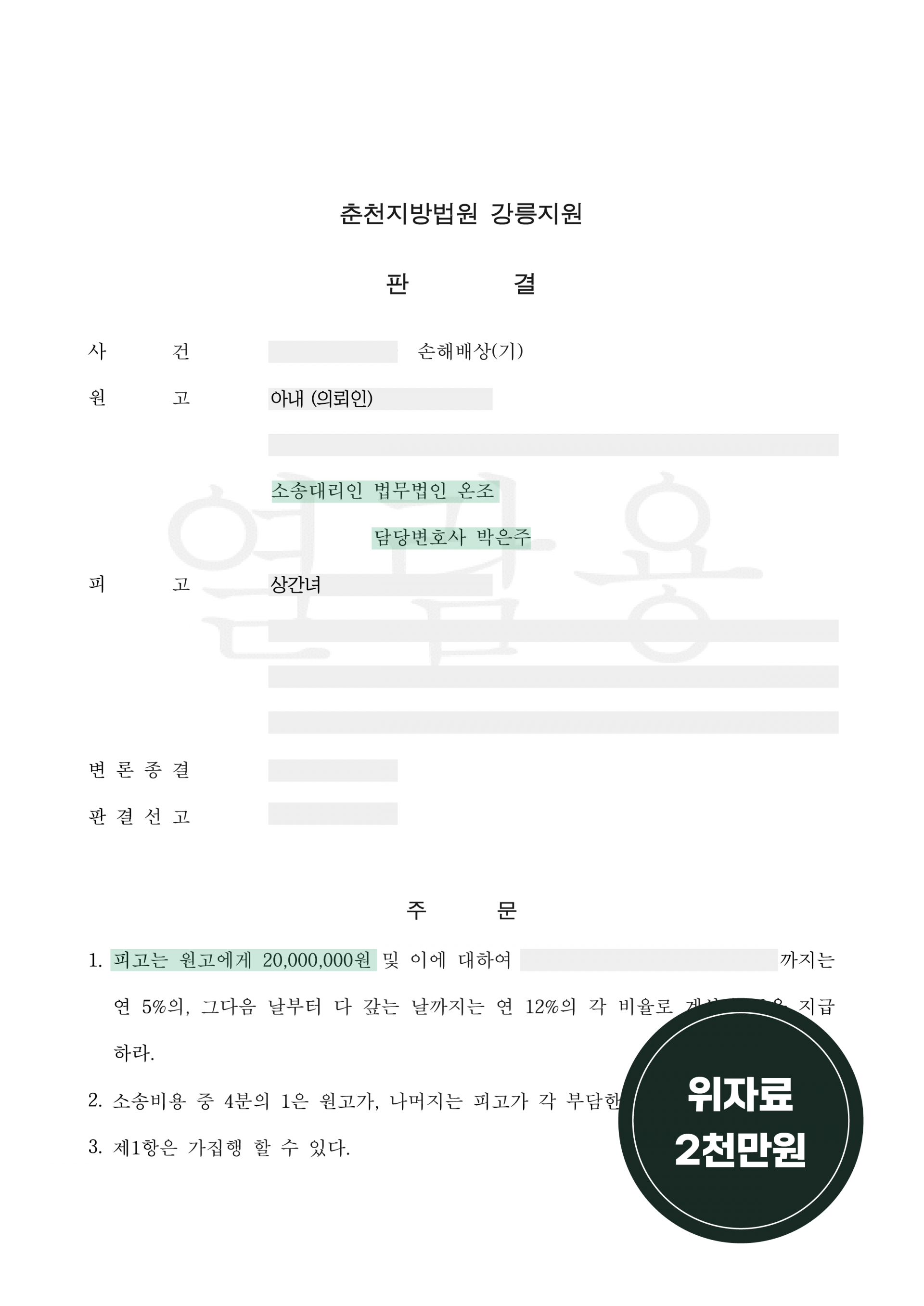[춘천지방법원 강릉지원] 상간녀소송 원고 대리하여 위자료 2,000만 원 인용된 사례