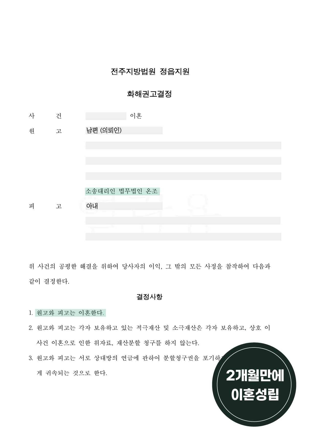 전주지방법원 정읍지원 재판부를 통해 최종적으로 2개월 만에 이혼소송 화해권고결정 받아내며 재산도 지켜낼 수 있었습니다.