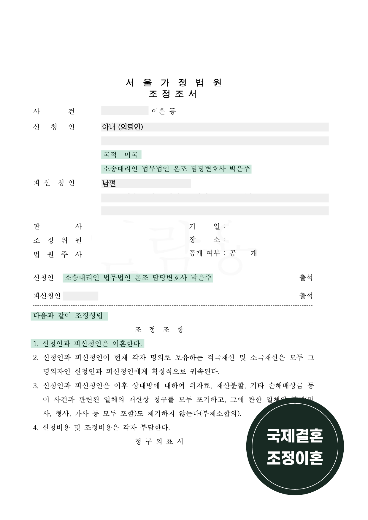 미국 국적의 국제결혼 외국인 대리하여 조정이혼 마무리한 사례