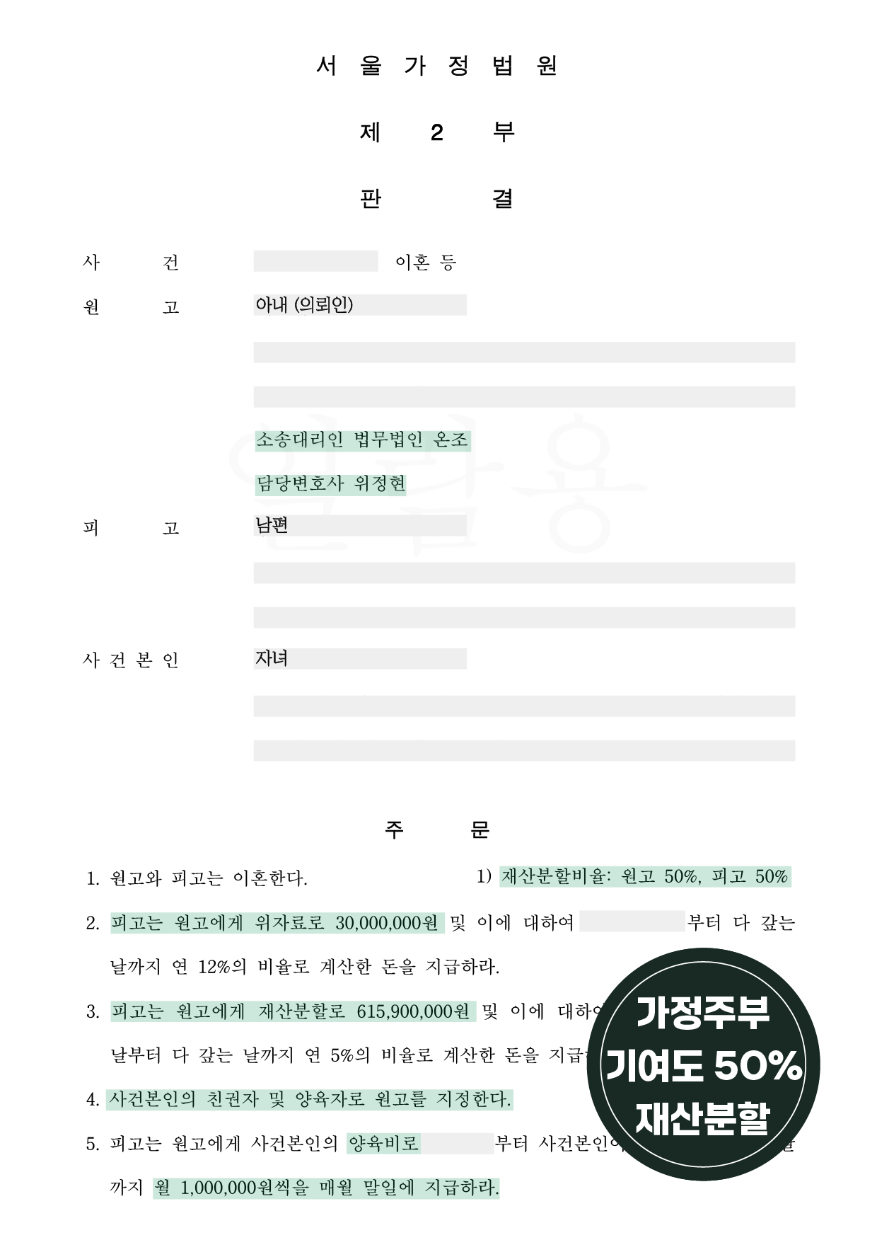 의뢰인의 가사와 양육 지분에 대하여 재산분할 총 50%를 인정해 주었는데요. 원고 측에서 초반 상담을 하면서 말씀하셨던 금액까지 받아낼 수 있었습니다.