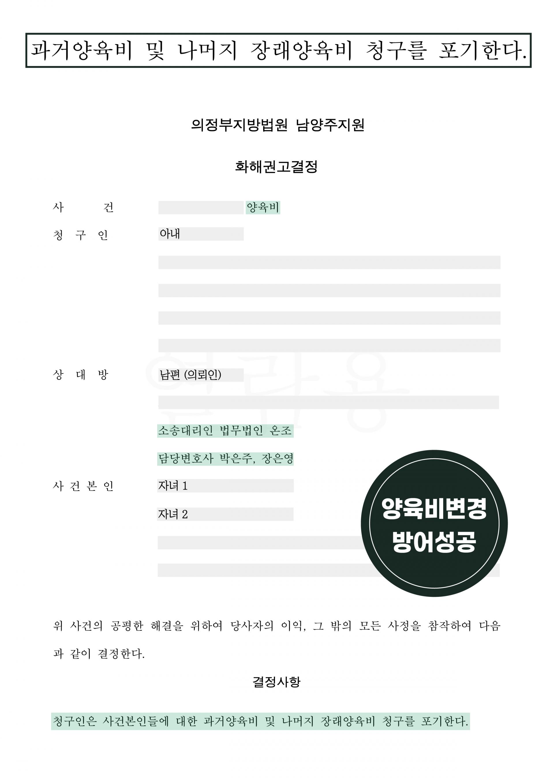 [의정부지방법원 남양주지원] 양육비변경청구 피고 대리하여 방어에 성공한 사례