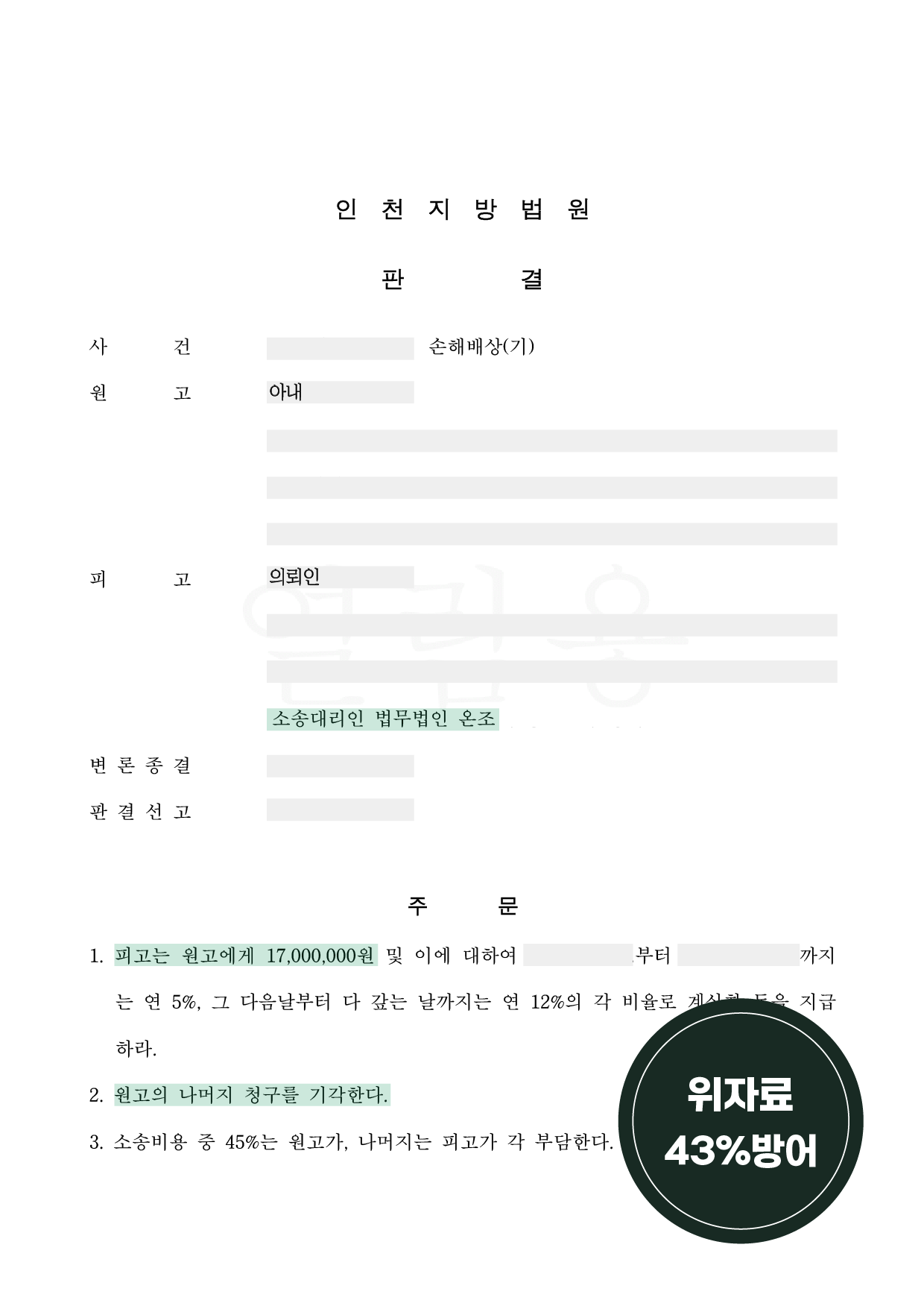 무엇보다 원고와 큰 다툼없이 사안이 신속하게 마무리될 수 있어서 의뢰인이 안도했습니다.